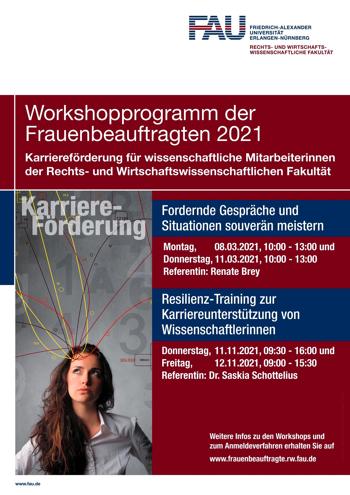 Auch 2021 bieten die Frauenbeauftragten der Rechts- und Wirtschaftswissenschaftlichen Fakultät für Nachwuchswissenschaftlerinnen zwei Workshops an.