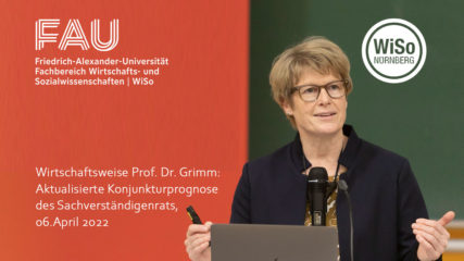 Am 6. April 2022 stellte Prof. Dr. Veronika Grimm, die den Lehrstuhl für Volkswirtschaftslehre, insbesondere Wirtschaftstheorie, leitet und seit April 2020 Mitglied des Sachverständigenrats ist, die aktualisierte Konjunkturprognose an der WiSo Nürnberg vor. Moderiert wurde die Veranstaltung von Prof. Dr. Thiess Büttner, Lehrstuhl für Volkswirtschaftslehre, insbesondere Finanzwissenschaft. Der Vortrag fand digital via Zoom statt und wurde zudem aufgezeichnet.