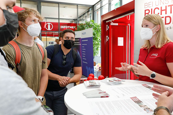 Erstmalig seit der Corona-Pandemie hat der Career Day an der WiSo Nürnberg am Dienstag, 21. Juni 2022, wieder in Präsenz stattgefunden. Rund 600 Besucherinnen und Besucher nutzten die Gelegenheit, um im WiSo-Gebäude an der Langen Gasse vorbeizuschauen. Auf der Firmenkontaktmesse hatten die Studierenden die Gelegenheit, sich bei den fast 20 teilnehmenden Partnerunternehmen über ihre Karrierechancen zu informieren. Bei interessanten und vielseitigen Workshops konnten sich die Teilnehmerinnen und Teilnehmer informieren und mit Coaches in Kontakt zu treten.