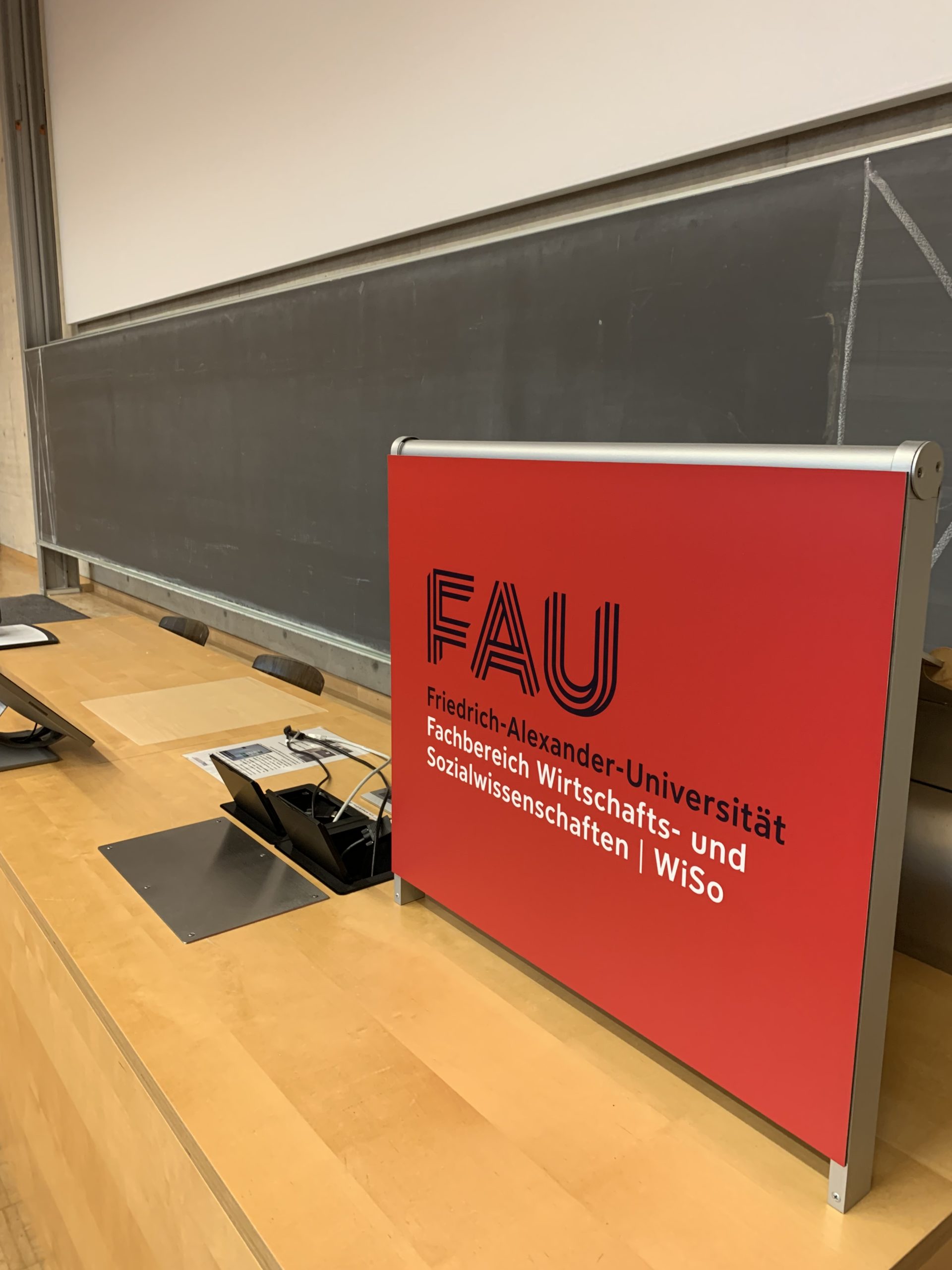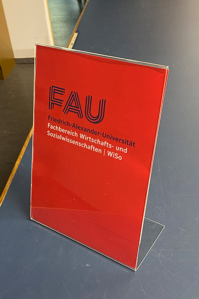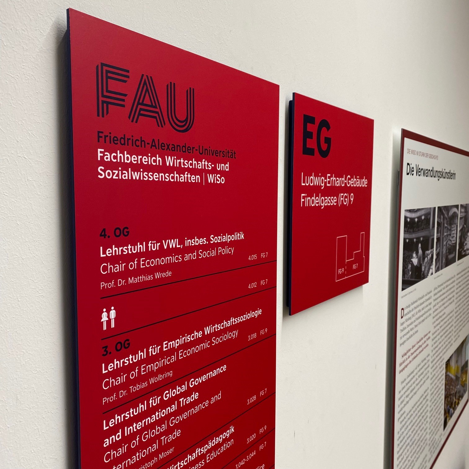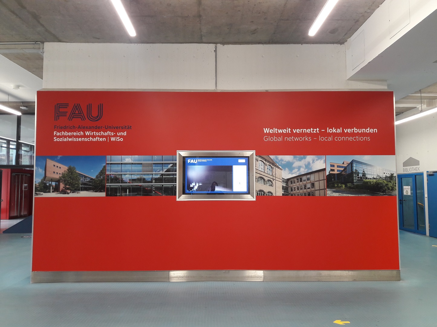 Zum Start ins Wintersemester 2022/23 wurden an zentralen Stellen mit hoher Sichtbarkeit im Gebäude die Beschriftungen und Marken-Logos im neuen Design angebracht. Dies kennzeichnet nun die Wände und Pulte in den großen Hörsälen, und macht die Marke des Fachbereichs WiSo für alle Besuchenden sichtbar. In weiteren Hörsälen und Seminarräumen zeigen sogenannte L-Aufsteller das Corporate Design. Vor den beiden WiSo-Gebäuden in der Langen Gasse und Findelgasse wehen Fahnen mit dem neuen FAU-Logo und den rot-blauen Farben der WiSo im Wind. Im Gebäude in der Findelgasse weist zudem ein neues Leitsystem mit Schildern im neuen Design der FAU WiSo den Weg durchs Haus. Weitere Maßnahmen, die alle durch Fördermittel finanziert werden, sind in Arbeit. Der Sprecher des Fachbereichs, Prof. Dr. Thomas M. Fischer, dankt allen Beteiligten: „Unser Team für Kommunikation und Marketing hat unter der Leitung von Silke Sauer in kurzer Zeit Vieles erfolgreich umgesetzt. Das gibt uns auch wichtige Impulse im derzeit laufenden Strategieprozess an der WiSo und in der FAU.“