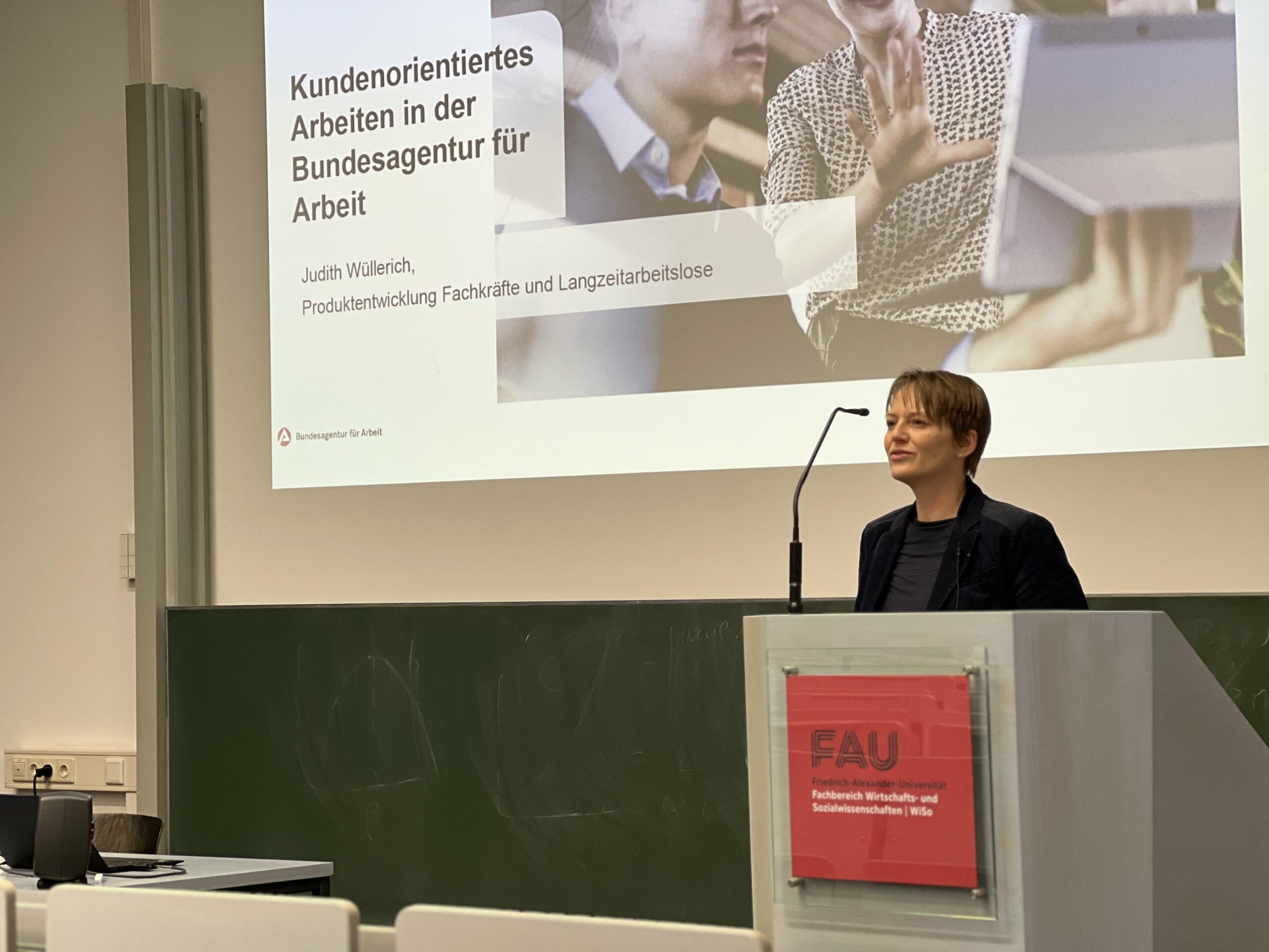 „Kundenorientiertes Arbeiten in der Bundesagentur für Arbeit“: Das war das Thema eines Vortrags von Judith Wüllerich von der Bundesagentur für Arbeit am Fachbereich Wirtschafts- und Sozialwissenschaften der FAU (FAU WiSo), der im Rahmen der Studienrichtung „Wirtschaft, Politik und Gesellschaft“ des Bachelors Wirtschaftswissenschaften stattfand.