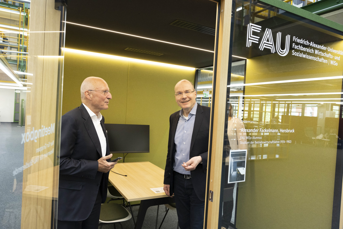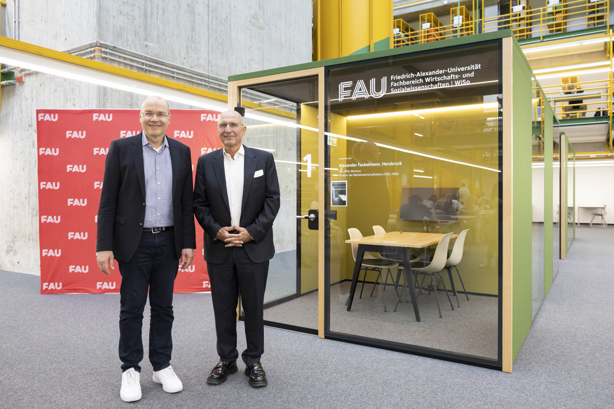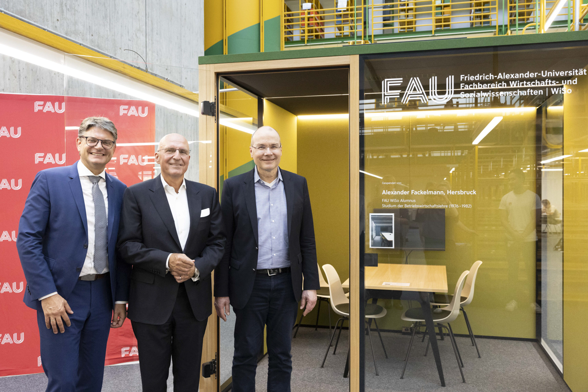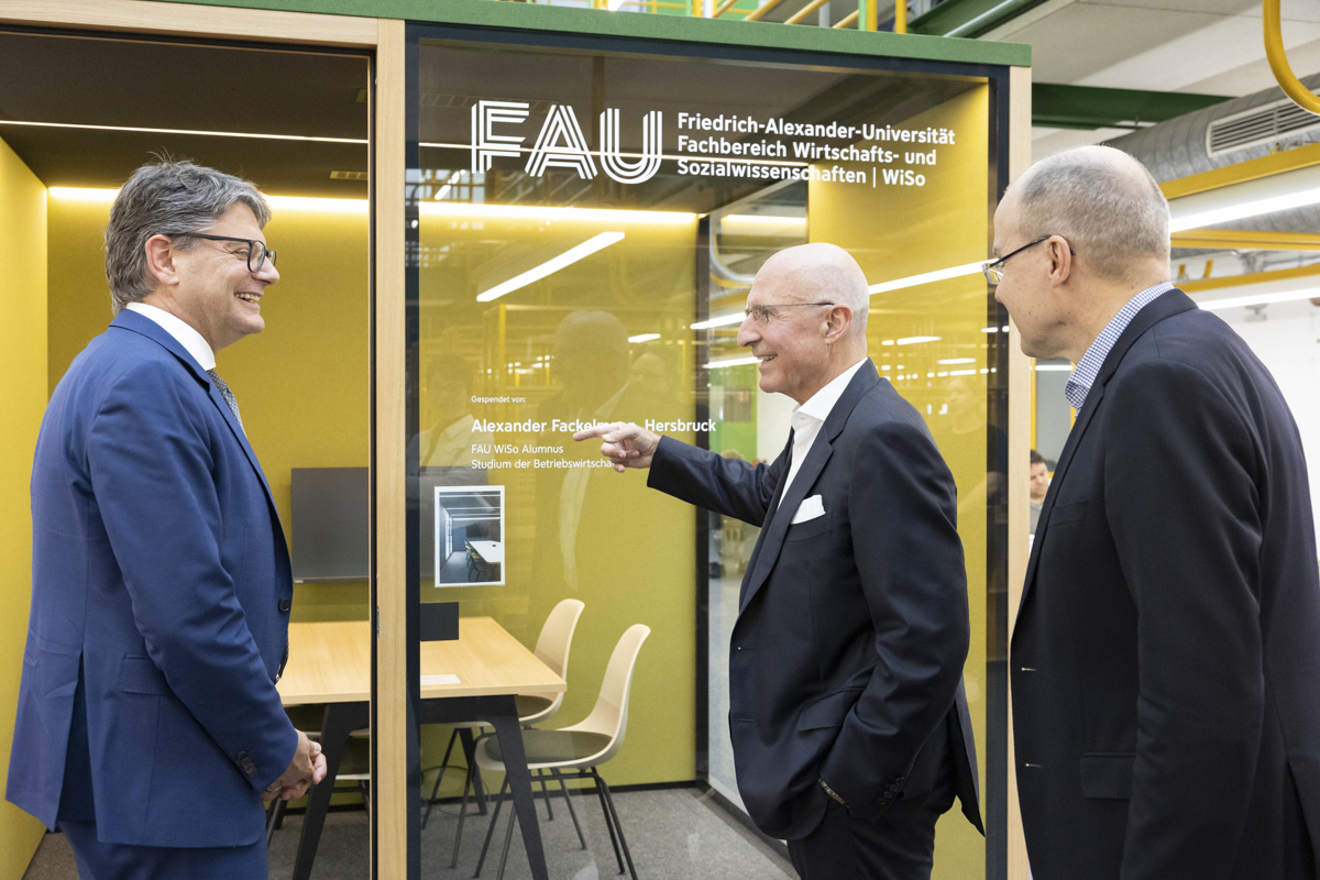 Dank der großzügigen Spende von Alexander Fackelmann, der von 1976 bis 1982 an der FAU WiSo Betriebswirtschaft mit Abschluss Diplom-Kaufmann studiert hat, sind in der FAU WiSo Bibliothek nun vier hochmoderne Cubes für studentische Gruppenarbeiten nutzbar. „Ich möchte dem Fachbereich gerne etwas zurückgeben, an dem ich viel für meine Tätigkeit als Unternehmer gelernt habe“, sagte der Stifter, Alexander Fackelmann, bei der Übergabe. „Die großzügige Spende von Alexander Fackelmann zeigt einmal mehr, von welch großem Wert Alumni für eine Universität sind“, führte der Präsident der FAU, Prof. Dr.-Ing. Joachim Hornegger, bei der Einweihung am 30. April 2024 aus.