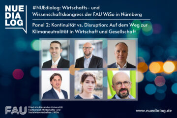 Diese und weitere Fragen sollen innerhalb des Panels mit den externen Gästen Dr. Sören Buttkereit (Chief Operating Oficer (COO) bei der NOW Partners Foundation), Sebastian Hemmer (WiSo-Alumnus, Projektleiter „Klimapakt2030plus“ der Europäischen Metropolregion Nürnberg), Darya Sotoodeh (Sprecherin Fridays for Future Deutschland) und Dr. Markus Janser (Senior Researcher am Institut für Arbeitsmarkt- und Berufsforschung (IAB)) beleuchtet werden.