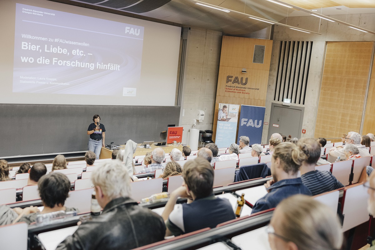„Bier, Liebe etc. – wo die Forschung hinfällt“, das versprach der Science Slam im Rahmen der Reihe #FAUwissenwollen am 9. Juli 2025 an der FAU WiSo.