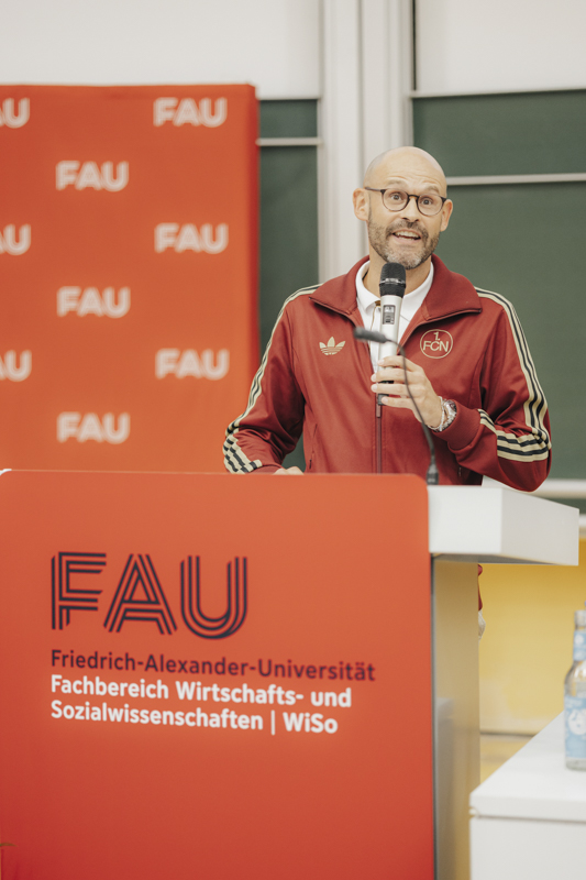 Prof. Dr. Mario Liebensteiner, der Schirmherr der Veranstaltung, begrüßte die Absolventinnen und Absolventen und führte durch die Veranstaltung. Mit einem Grußwort richtete sich neben der SPD-Fraktionsvorsitzenden im Stadtrat der Stadt Nürnberg, Christine Kayser, auch Eva-Maria Hackenschmied, Vorstandssprecherin beim Alumni & Freunde WiSo Nürnberg e.V., an die Absolventinnen und Absolventen. Den Festvortrag hielt FAU WiSo-Alumnus Dr. Jörg Burkhardt, Head of Sales & New Partnerships beim 1. FC Nürnberg.