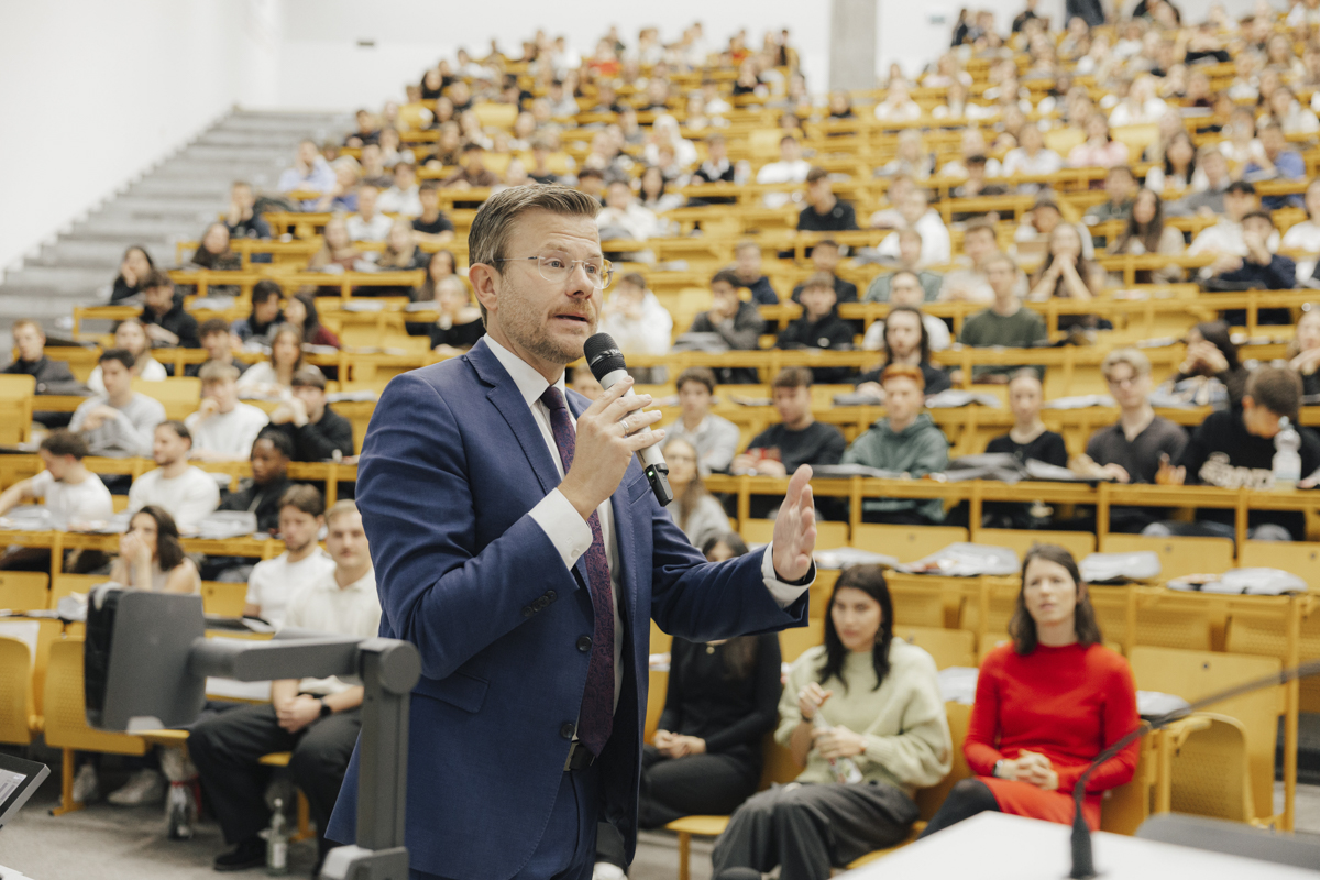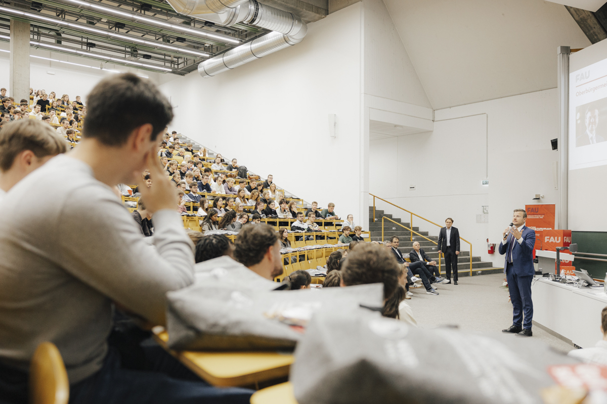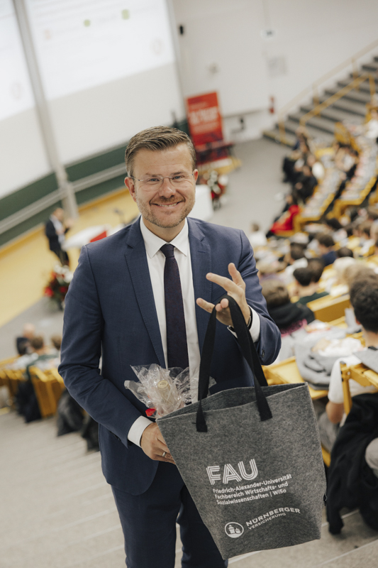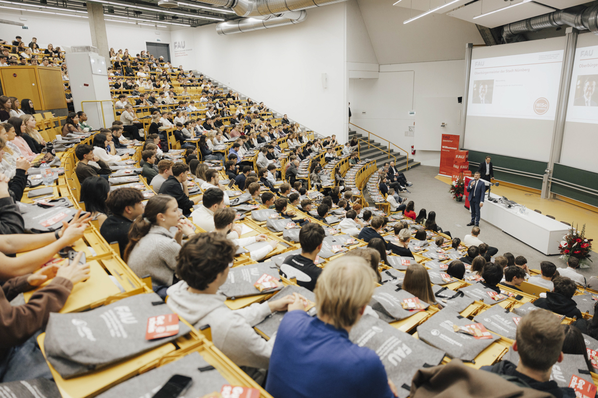 Die Vorlesungszeit hat begonnen und die FAU WiSo begrüßt ihre neuen und alten Studierenden auf ihrem City-Campus im Herzen Nürnbergs. Zum Start ins Wintersemester 2025/26 ist auf dem WiSo-Gelände an der Langen Gasse einiges geboten: Nach der Begrüßung der Erstsemester durch den Studiendekan der FAU WiSo Prof. Dr. Karl Wilbers richtete Nürnbergs Oberbürgermeister Marcus König herzliche Worte an die Studienanfängerinnen und Studienanfänger.