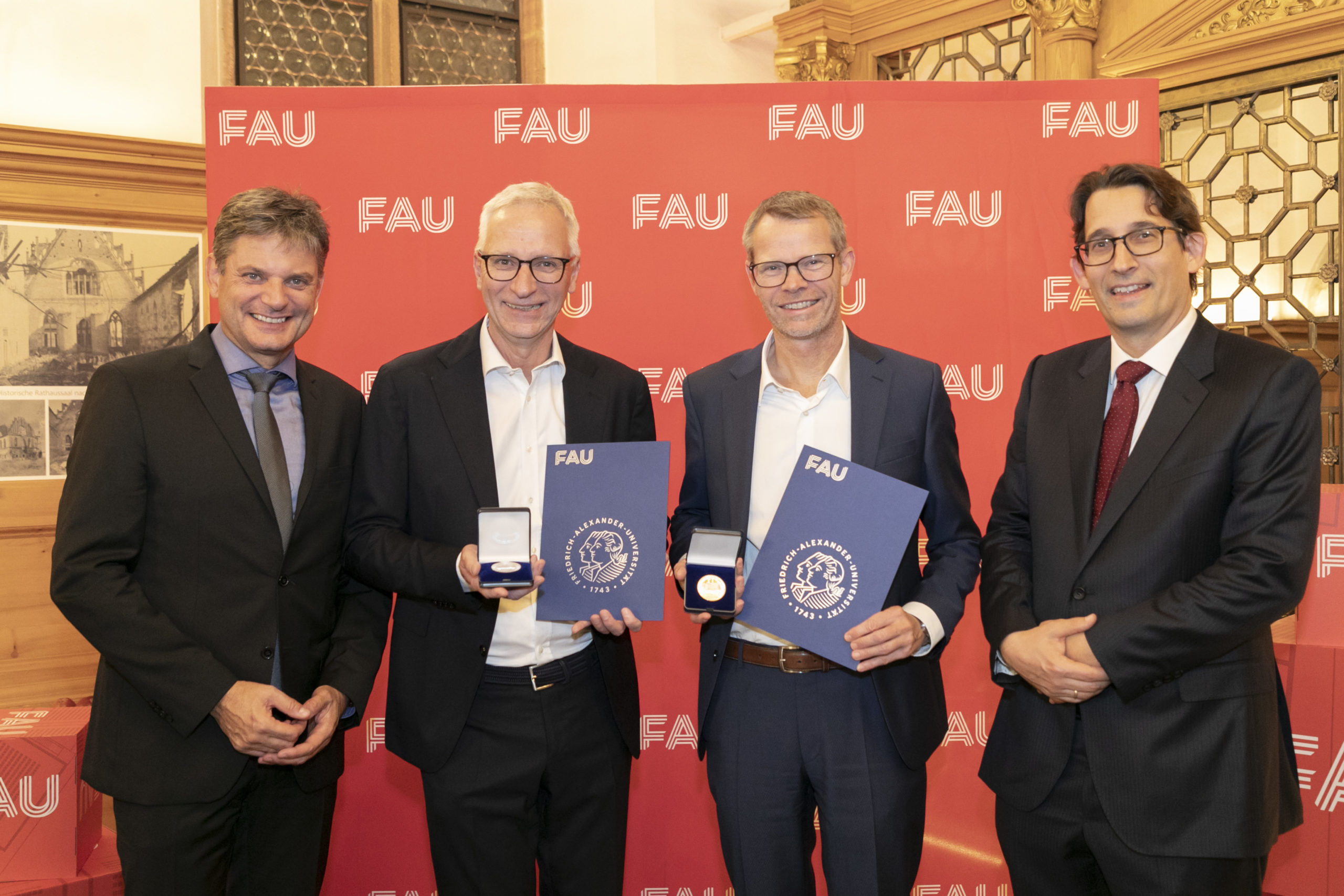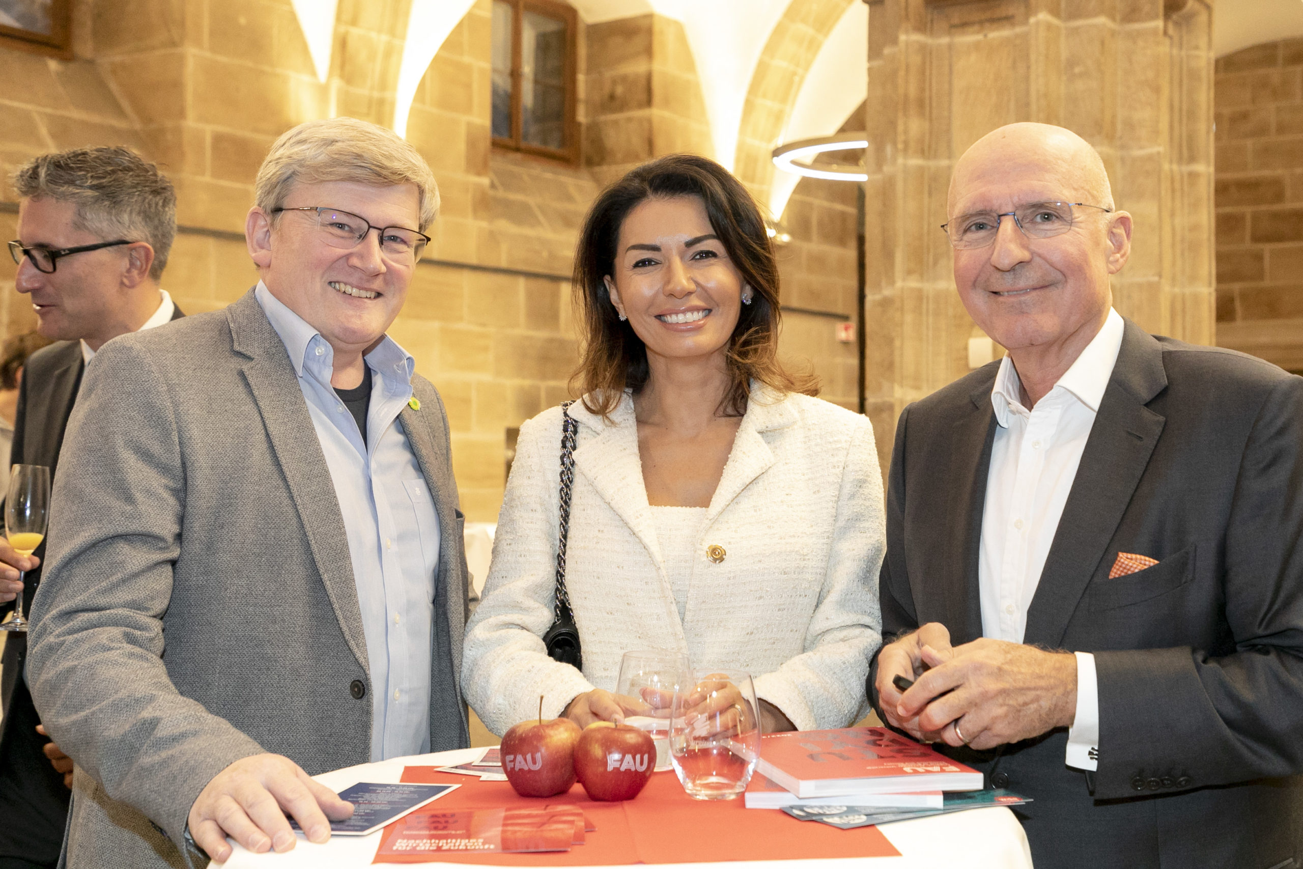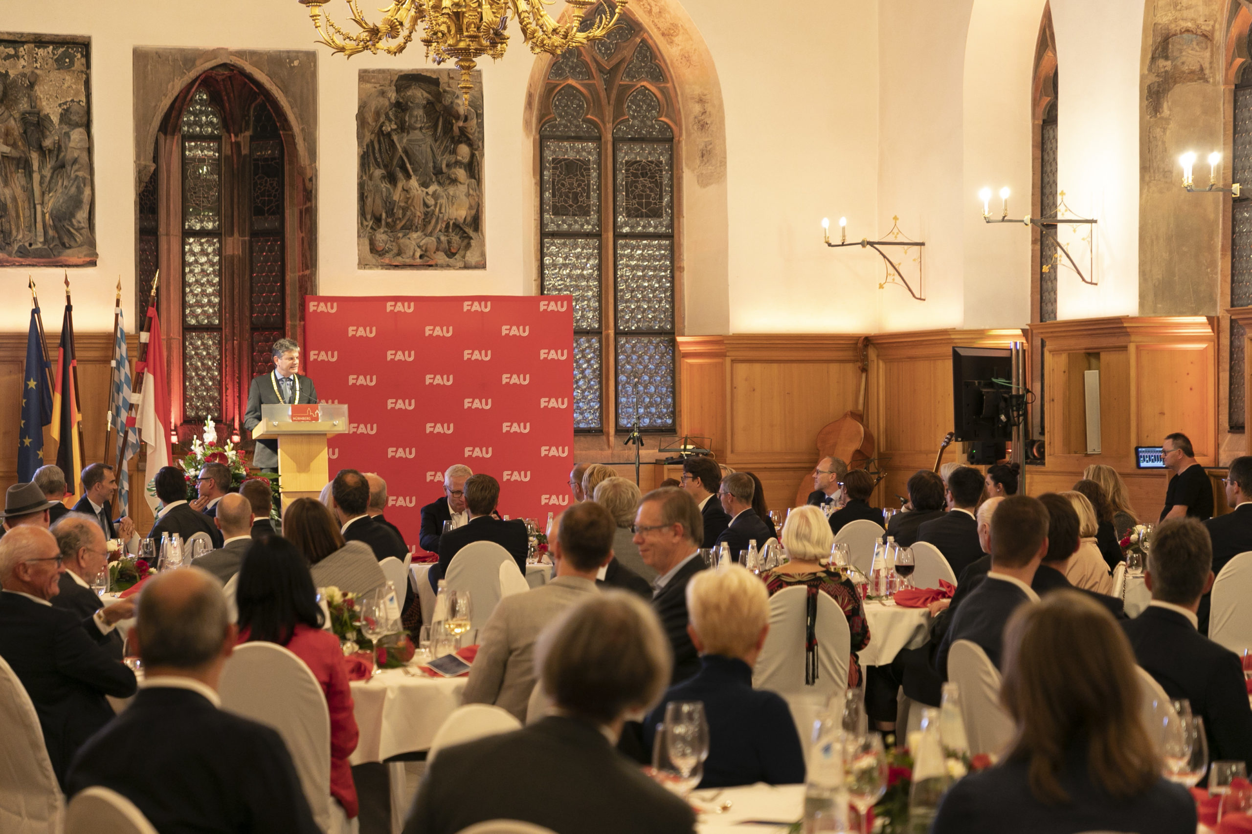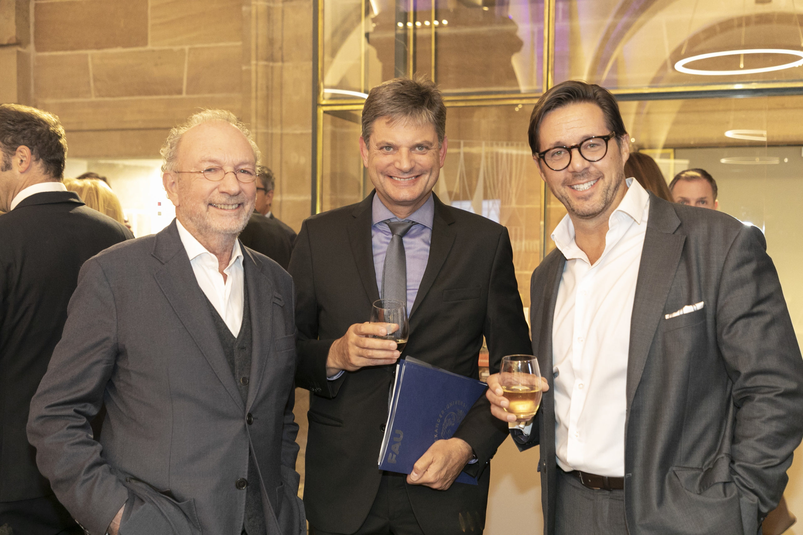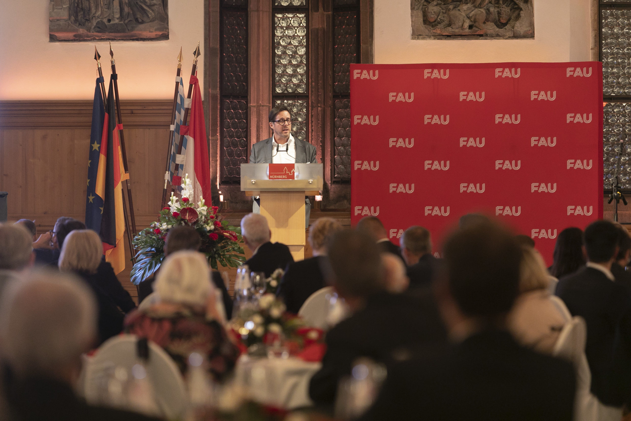 Neben dem Blick zurück war aber auch der Blick in die Zukunft von zentraler Bedeutung während des festlichen Dinners. Denn heute ist die Transformation von Wirtschaft und Gesellschaft hin zur Nachhaltigkeit eine solche drängende Frage. Bereits jetzt gibt es eine Vielzahl an Aktivitäten in Lehre und Forschung sowie im Leben auf dem Campus. In Zukunft werden die vielfältigen relevanten Aktivitäten noch stärker zusammengeführt, transparent gemacht, vernetzt und weiterentwickelt werden. Dazu haben Professorinnen und Professoren aus der WiSo und aus allen Fakultäten der FAU das Forum Nachhaltigkeit gegründet. Im Festvortrag des WiSo-Dinners erläuterten die Professoren Markus Beckmann und Matthias Fifka die Bedeutung dieser Gründung und die zukünftigen Aufgaben des Forum N – Forum für nachhaltiges Wirtschaften.