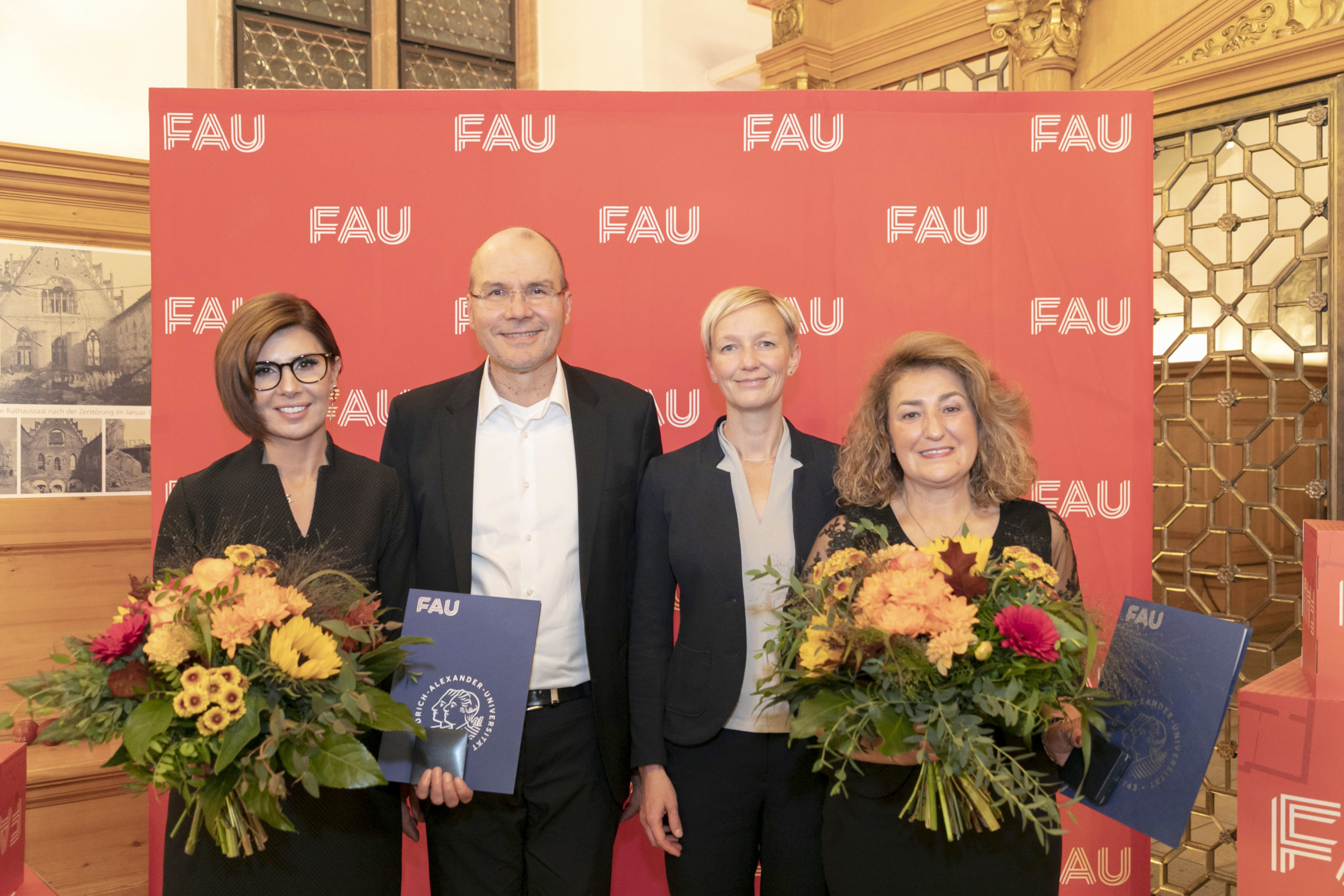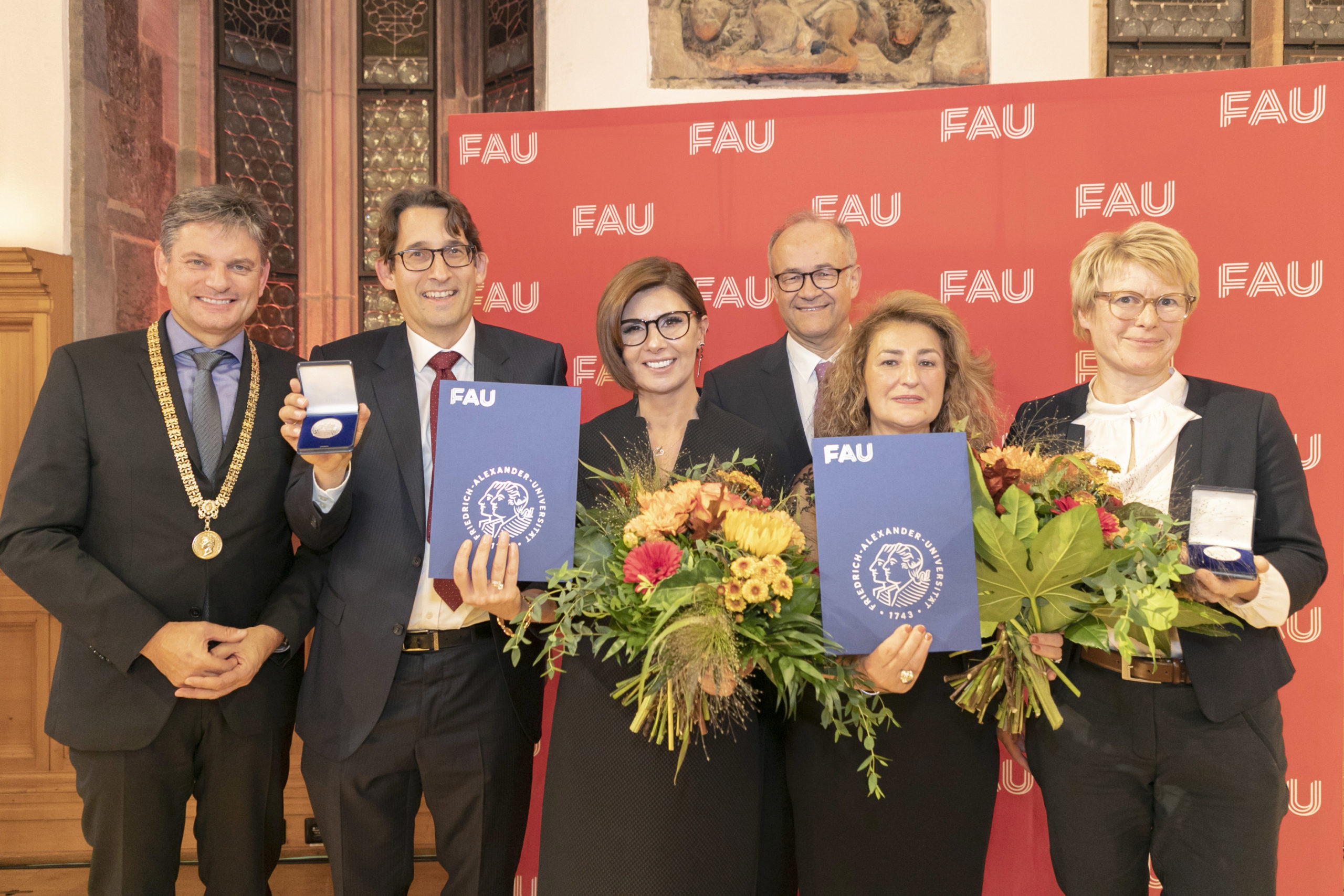 Des Weiteren wurden auch 2022 wieder die WiSo-Ehrenmedaillen verliehen. Für 2020 hat das große Engagement der Belegschaft im Rahmen der laufenden Sanierung der WiSo-Gebäude Wertschätzung erfahren. Fatma Eksi und Kadriye Tanrikolu wurde die Auszeichnung stellvertretend für die hohe Einsatzbereitschaft der Beschäftigten an der WiSo verliehen. Für 2021 ging die Ehrenmedaille an Roland Auschel und Harm Ohlmeyer, Vorstände bei der adidas AG, für ihr viele Jahre währendes intensives Engagement an der WiSo. Gratulation und Dank an die Preisträgerinnen und Preisträger!
